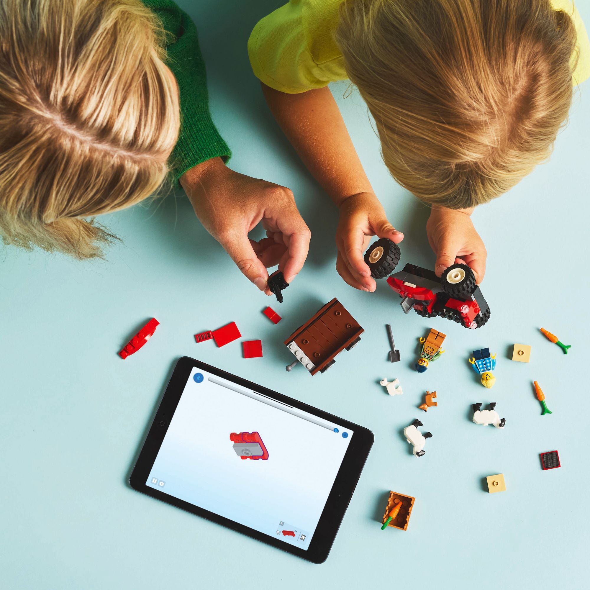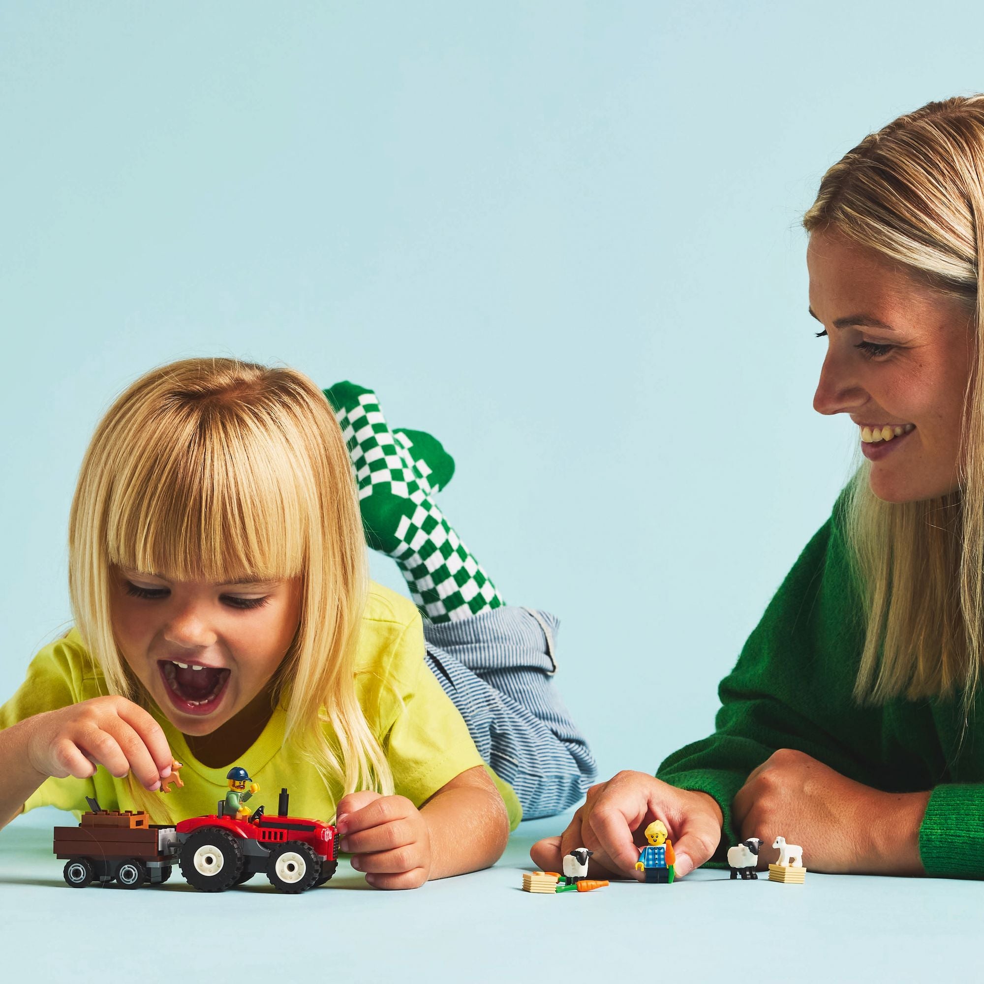 Join the farmer and his daughter in the LEGO® City countryside. Hitch up the trailer and load the hay bales, basket of carrots and your cute puppy dog. Then jump aboard the cool red tractor and head for the fields. Rough ground is no problem for these huge tires! Feed the sheep some tasty hay and check the lambs are healthy. Fun farming adventures await in LEGO City! Tractor and sheep toy playset for ages 4+ Bring a countryside vibe to your child's playtime with the LEGO® City Red Farm Tractor with Trailer & Sheep playset for imaginative storytelling Whats in the box? This farming toy set includes everything kids need to build a toy tractor, trailer and 2 minifigures, plus 2 sheep figures, a lamb figure and a puppy figure Fun farm toy for kids Kids can load up the trailer and head out for fun farming adventures aboard the red tractor LEGO® minifigure accessories This farm toy set comes with accessories for pretend play, including a basket of carrots, 2 toy hay bales and a shovel A fun gift for kids Give the LEGO® City Red Farm Tractor with Trailer & Sheep building set as a gift or any-day surprise for boys and girls aged 4 and up Tractor toy building playset designed for ages 4 and up Includes a LEGO® Starter Brick element, a simple pictorial building guide and 3D digital guidance in the LEGO Builder app Make learning fun LEGO® City building sets help kids develop confidence and key life skills through open-ended creative play Dimensions The farm tractor in this 116-piece LEGO® City set measures over 2 in. (5 cm) high, 3.5 in. (9 cm) long and 2.5 in. (6 cm) wide