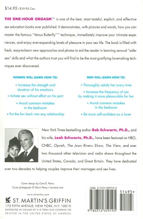 The One-Hour Orgasm is one of the best, most tasteful, explicit and effective sex education books ever published. It demonstrates, with pictures and words, how you can master the famous "Venus Butterfly" technique, immediately improve your intimate experiences, and enjoy ever-expanding levels of pleasure in your sex life. The book is filled with fresh, easy-to-learn new approaches and photos to aid the reader in learning sensual "safer sex" skills and what the authors trust you will find to be the most gratifying lovemaking techniques ever discovered.