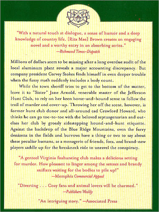 Incomparable author Rita Mae Brown returns to the glorious hills of Virginia and its genteel foxhunting society, where how much money you have in the bank is not nearly as important as how long your family has lived on the land–and where nearly everyone has something to hide. As Sister muses, “The little secrets leak out. The big ones, well, some escape like evils from Pandora’s box. And others we’ll never know.”