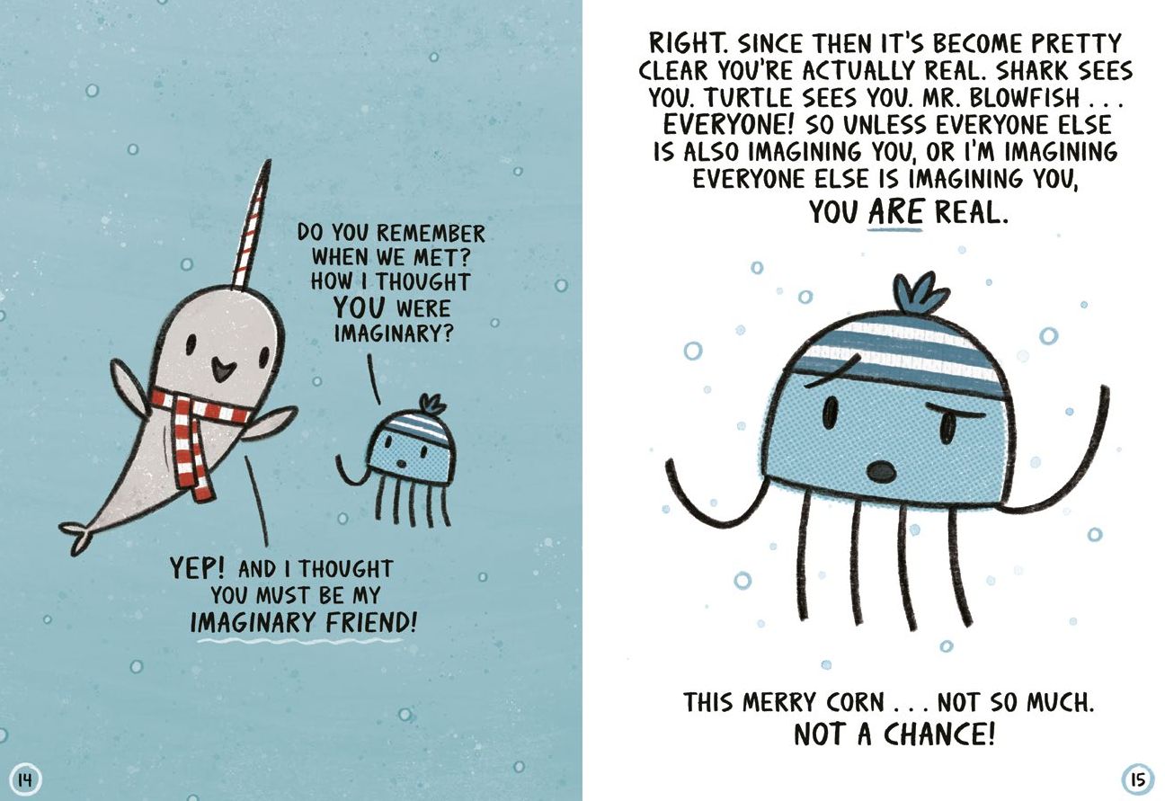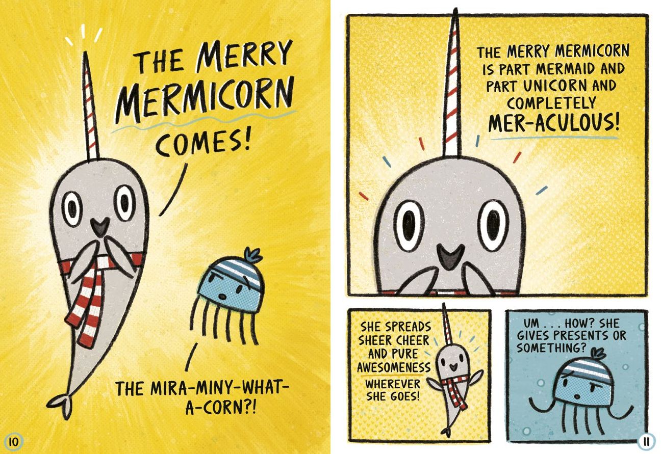 Dive into three new stories about Narwhal's favorite time of the year! It's the festive season in the world wide waters, and Narwhal is looking forward to cozying up with a good book, singing and partying with pod pals and enjoying some warm waffle pudding. But most of all Narwhal is excited about the arrival of the Merry Mermicorn! According to Narwhal, she's part mermaid, part unicorn and completely mer-aculous! Jelly is of course skeptical about the existence of the "Mira-Miny-What-A Corn" . . . even when he receives a mysterious present. It must be from Narwhal.