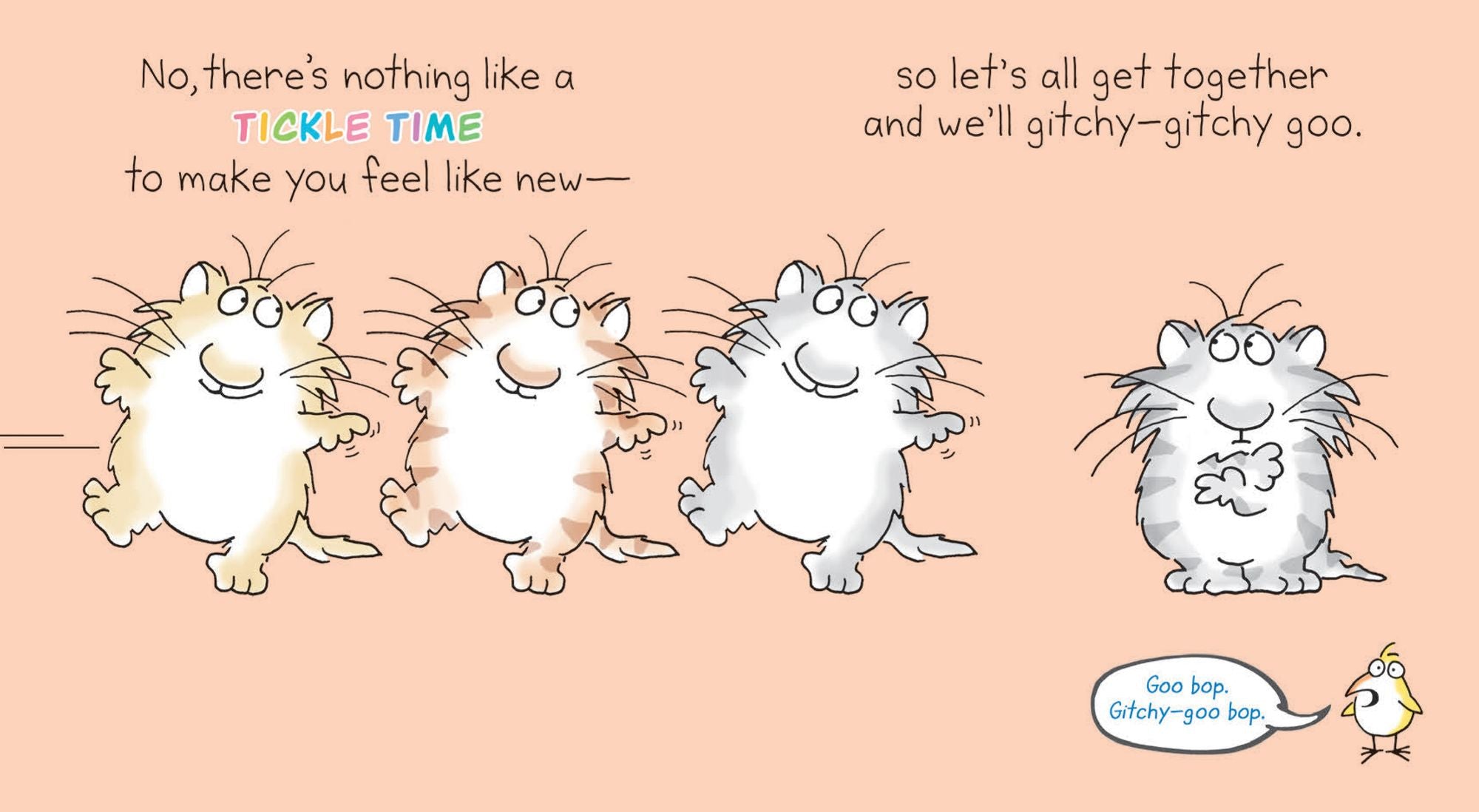 Tickle Time! is the twelfth in Boynton’s astoundingly successful Boynton on Board series. Based on the wildly popular song from Boynton’s wildly popular Rhinoceros Tap CD, Tickle Time! is pure irrepressible Boynton, lively in tempo, nimble in rhyme, and filled with irresistible fuzzy cats that cavort from page to page. Plus a few birds, who aren’t the cavorting type. Here’s a book to turn to again and again, because it’s guaranteed to elicit giggles: