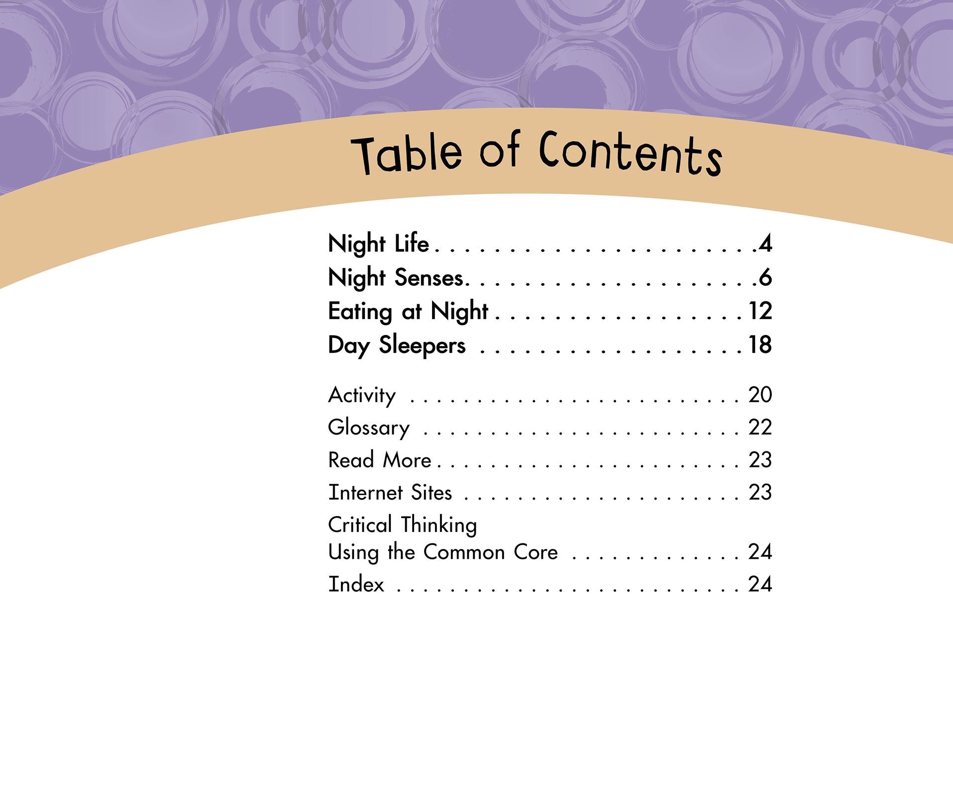 Simple text and bright photographs explain the concept of nocturnal animals for beginning readers. The book concludes with a simple, kid-friendly activity.