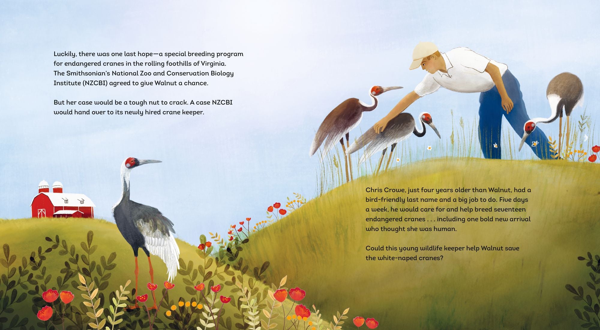 What was wrong with Walnut? The white-naped crane was friendly and curious—except when it came to other cranes. Raised by humans, Walnut didn’t see herself as a bird and could not live peacefully—or breed—with others of her species. Rejected by several zoos, she arrived at the Smithsonian’s National Zoo Conservation Biology Institute. Would this be her last chance? Meanwhile, Chris Crowe had also just arrived at the zoo, as crane keeper. It was his job to care for and help breed the birds at the institute. It was clear that breeding Walnut wasn’t going to be easy, but with skill and patience, Chris slowly earned the crane’s trust, and an extraordinary partnership evolved. In a Smithsonian Kids picture book sure to appeal to wildlife fans—and anyone who appreciates a unique unlikely friendship tale—award-winning author Meeg Pincus shares the story of the incredible bond between a crane and her keeper.