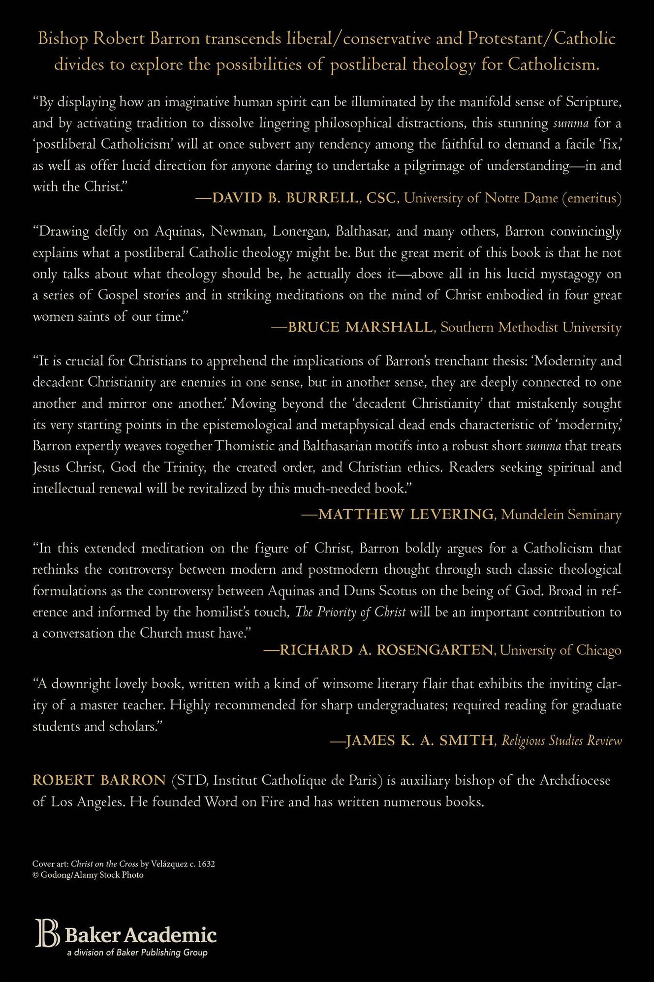 For a long time, Christians have tried to bridge the divide between Christianity and secular liberalism with philosophizing and theologizing. In The Priority of Christ, Bishop Robert Barron shows that the answer to this debateand the way to move forwardlies in Jesus. Barron transcends the usual liberal/conservative or Protestant/Catholic divides with a postliberal Catholicism that brings the focus back on Jesus as revealed in the New Testament narratives.