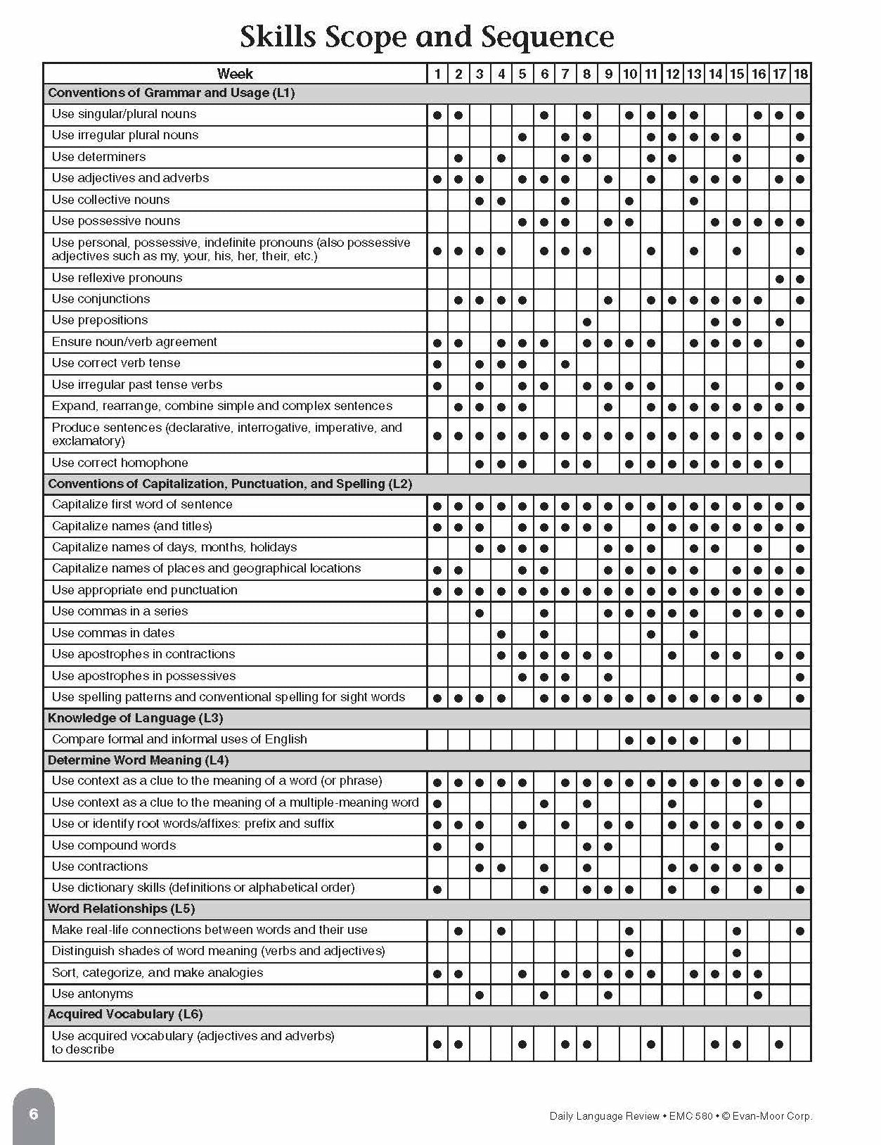 - The skills scope and sequence details the skills practiced each week