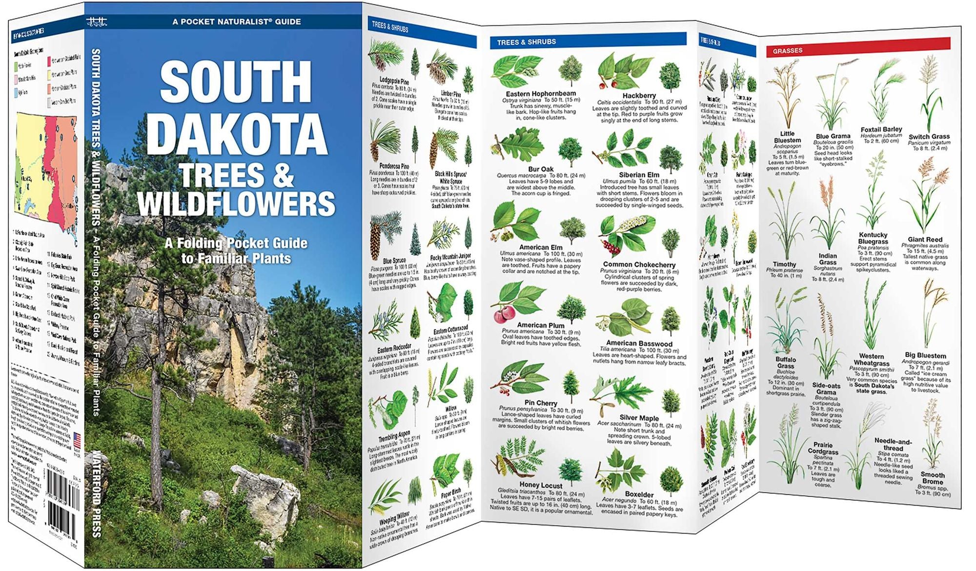 Much of South Dakota is covered in rich grassland and farmland. There are also pockets of forest, badlands, mountains, and myriad wetlands. Thousands of plants grow across the Mount Rushmore State’s sweeping landscapes, including important pollinators like goldenrods, coneflowers, asters, and state wildflower Pasque Flower. Plants are often seen as a major aspect of a landscape’s character, so it helps to get acquainted with the most familiar species to establish a solid foundation of knowledge on which to build. You can do this with the portable reference South Dakota Trees & Wildflowers, which includes beautiful illustrations of 140 common trees, shrubs, and wildflowers as well as an ecoregion map showing over 20 botanical sanctuaries and learning sites. Laminated for durability, this lightweight, 12-panel folding pocket guide is the ideal companion for educators, learners, naturalists, and botanists who wish to forge deeper and more meaningful connections with the land through its flora. Made in the USA.