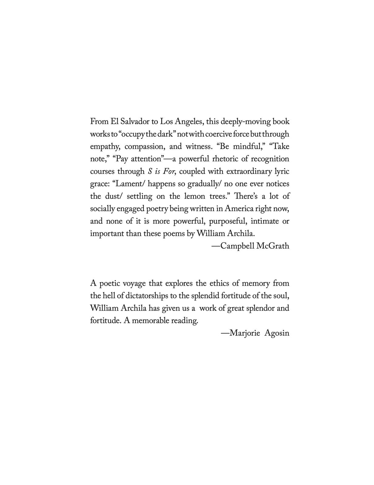 S is For is an investigation by poet William Archila of the Central American migrant crisis haunted by the past of the civil war in El Salvador, the meanings of family spirits, and trees disappearing to urban sprawl—always wielding the voice of the immigrant, the refugee, and the ever-present exile as a weapon against invisibility and displacement. Inventive and compassionate, Archila’s poems navigate the meanings of family spirits, weeds and wildflowers, and the irreverence to lay down roots with our dead. The collection expresses the importance of an inner voice from the perspective of exile—people with no country, no language, ghosts split between present and past, between home and foreign. In a variety of forms—quasi-sonnet, sestina, ekphrastic, syllabic, lyric, memorial—the poems create a bridge between flaws and fractures, between the northern region of Central America and the beloved north which is the US. S is for: every letter never uttered, but evoked.