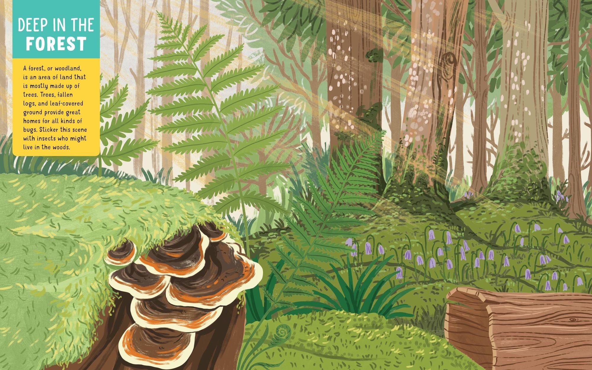 Explore bug habitats by adding stickers to the Sunny Meadow, Deep in the Forest, Life in the Water, and Backyard Garden scenes.