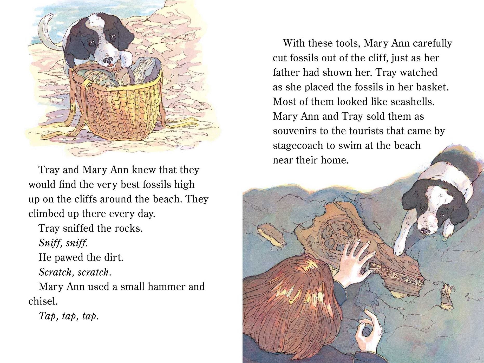 There once was a little dog named Tray. He lived in England with his owner, Mary Ann Anning. Tray loved to dig for dinosaur bones. Together, he and Mary Ann found small bones, big bones, and even entire skeletons! People came from all around the world to see the bones they found.