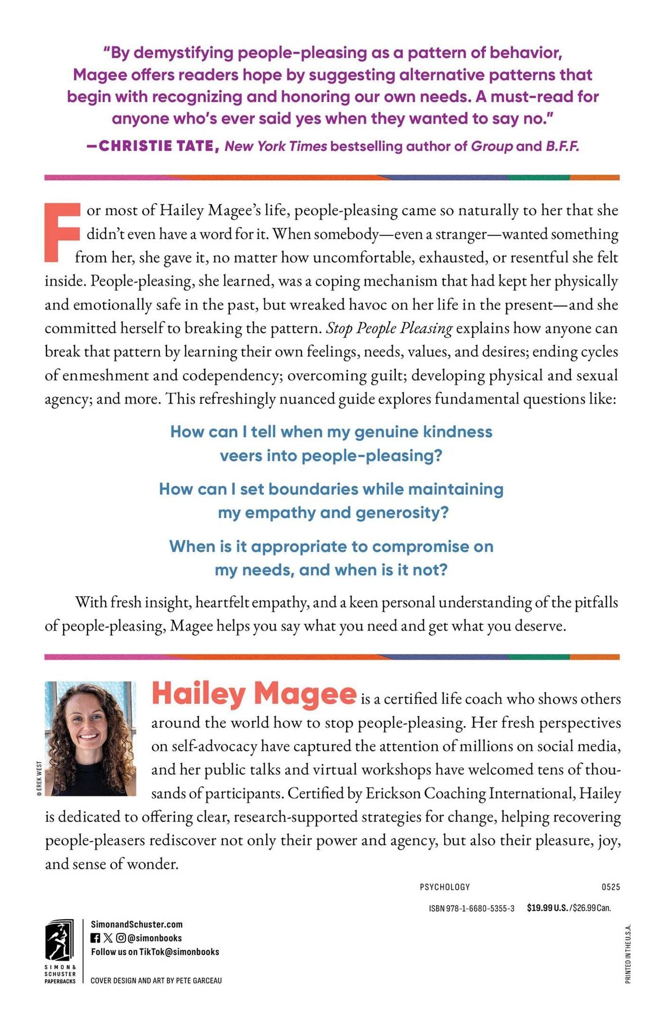 Combining social science, psychology, and hands-on coaching exercises, Stop People Pleasing teaches you how to connect with your own feelings, needs, and dreams; courageously advocate for yourself in your relationships with friends, family, and colleagues; soothe yourself through the growing pains of healing; and dive headfirst into pleasure and play. With fresh insight, heartfelt empathy, and a keen personal understanding of the pitfalls of people-pleasing, Magee helps you say what you need and get what you deserve.