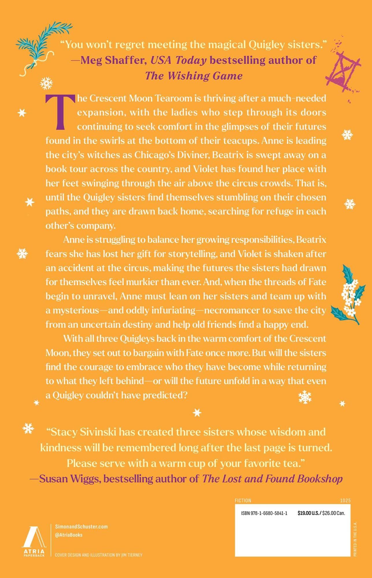 The Crescent Moon is thriving after a much-needed expansion, with the ladies who step through its doors continuing to seek comfort in the glimpses of their futures found in the swirls at the bottom of their teacups. Anne is leading the city’s witches as Chicago’s Diviner, Beatrix is swept away on a book tour across the country, and Violet has found her place with her feet swinging through the air above the circus crowds. That is, until the Quigley sisters find themselves stumbling on their chosen paths, and they are drawn back home in search of refuge in each other’s company.