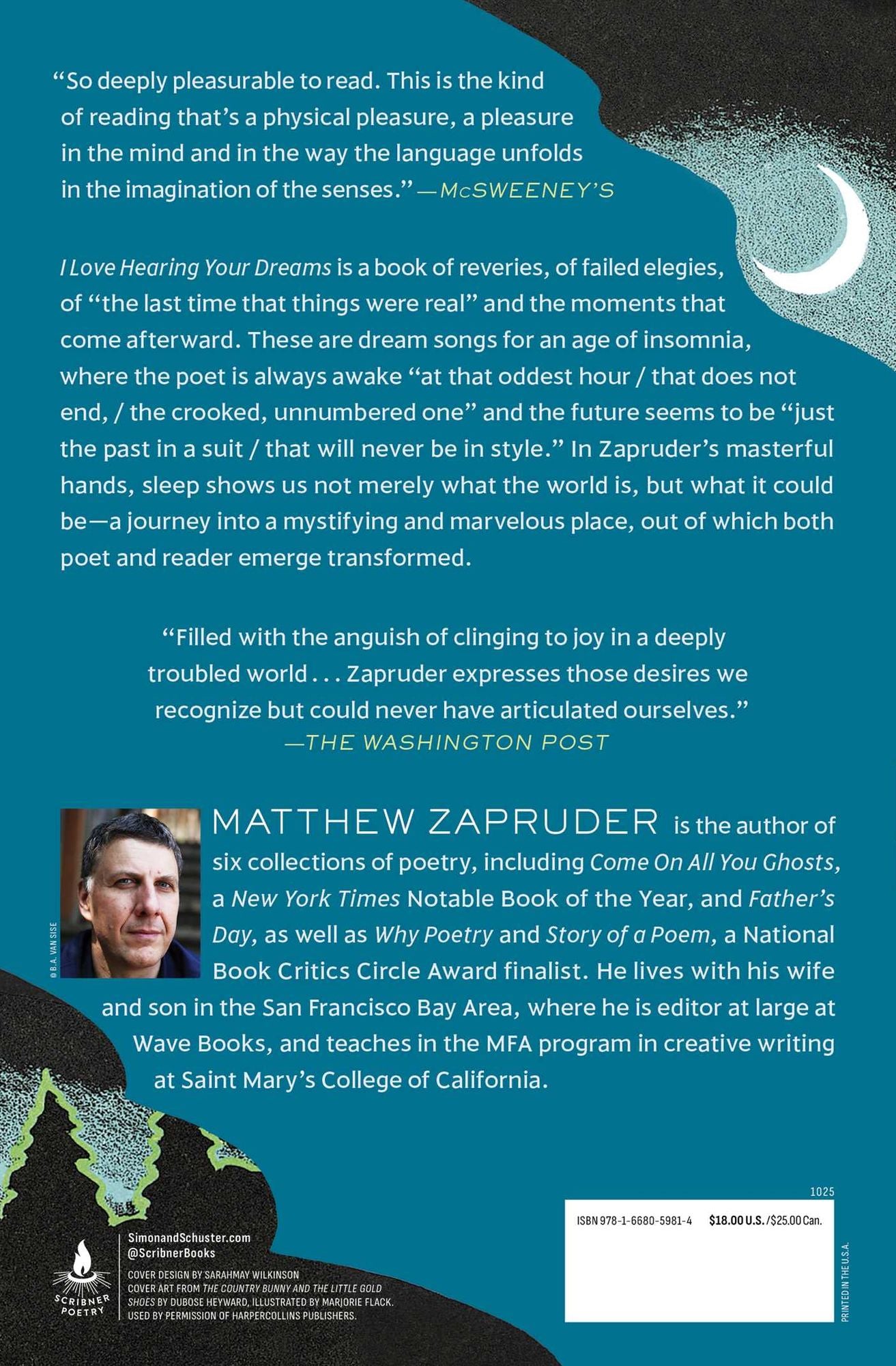 I Love Hearing Your Dreams is a book of reveries, of failed elegies, of “the last time that things were real” and the moments that come afterward. These are dream songs for an age of insomnia, where the poet is always awake “at that oddest hour / that does not end, / the crooked, unnumbered one” and the future seems to be “just the past in a suit / that will never be in style.” Yet dreams in Matthew Zapruder’s poems are also a place of possibility, of reality envisioned anew—sleep shows us not merely what the world is, but what it could be.