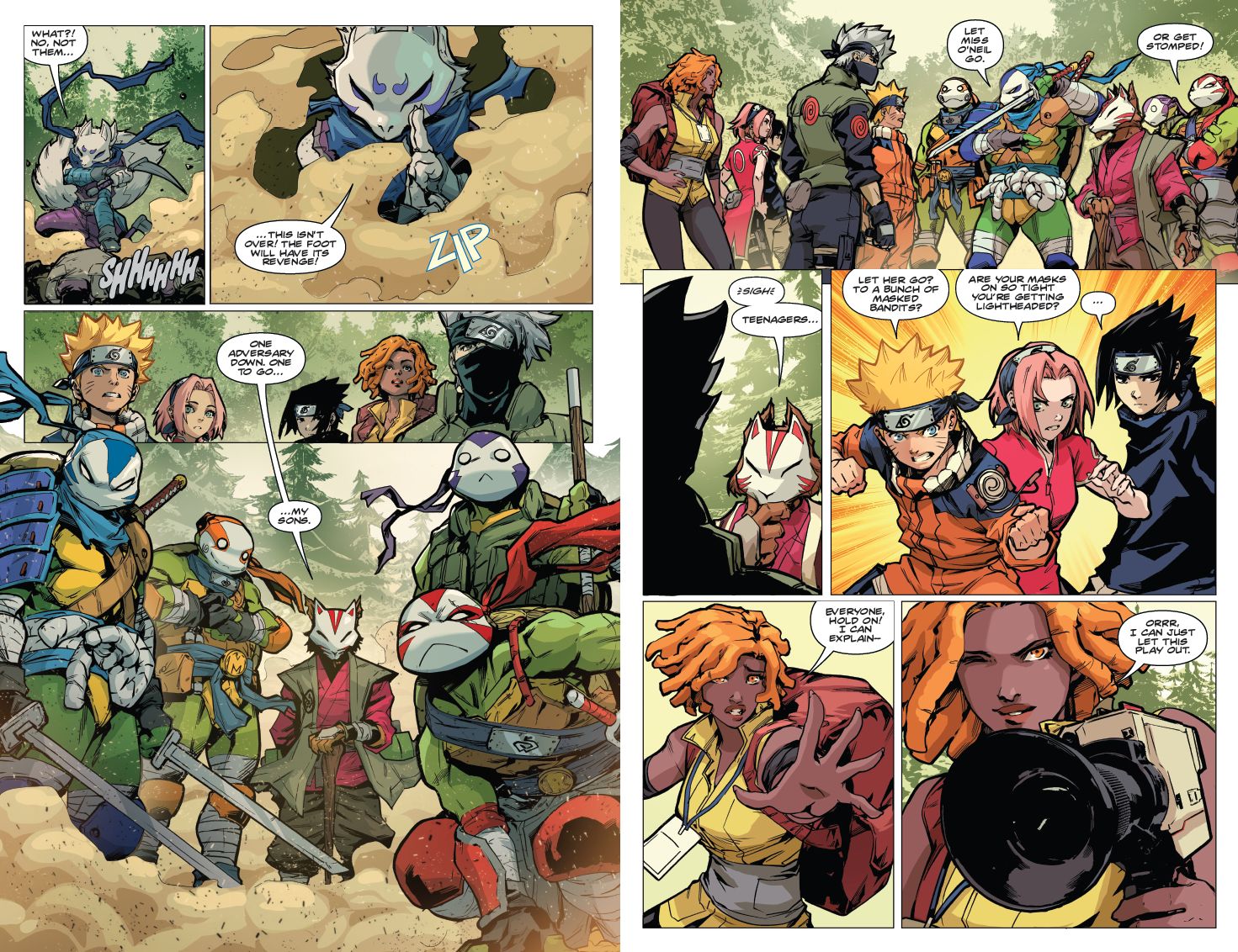 When teenage reporter April O’Neil has a clandestine meeting with Tsunade, the leader of the Hidden Leaf Village, it garners the attention of Naruto, Sasuke, Sakura, and Kakashi. They aren’t the only ones who are wondering what the two women were discussing, though. The sinister Foot Clan have their own interest in April’s visit, as they think she might hold the valuable information on mutation research being conducted by the scientist Baxter Stockman. With April caught between the forces of the Hidden Leaf Village and the Foot Clan, it can’t be long before the Teenage Mutant Ninja Turtles show up to lend her a hand!